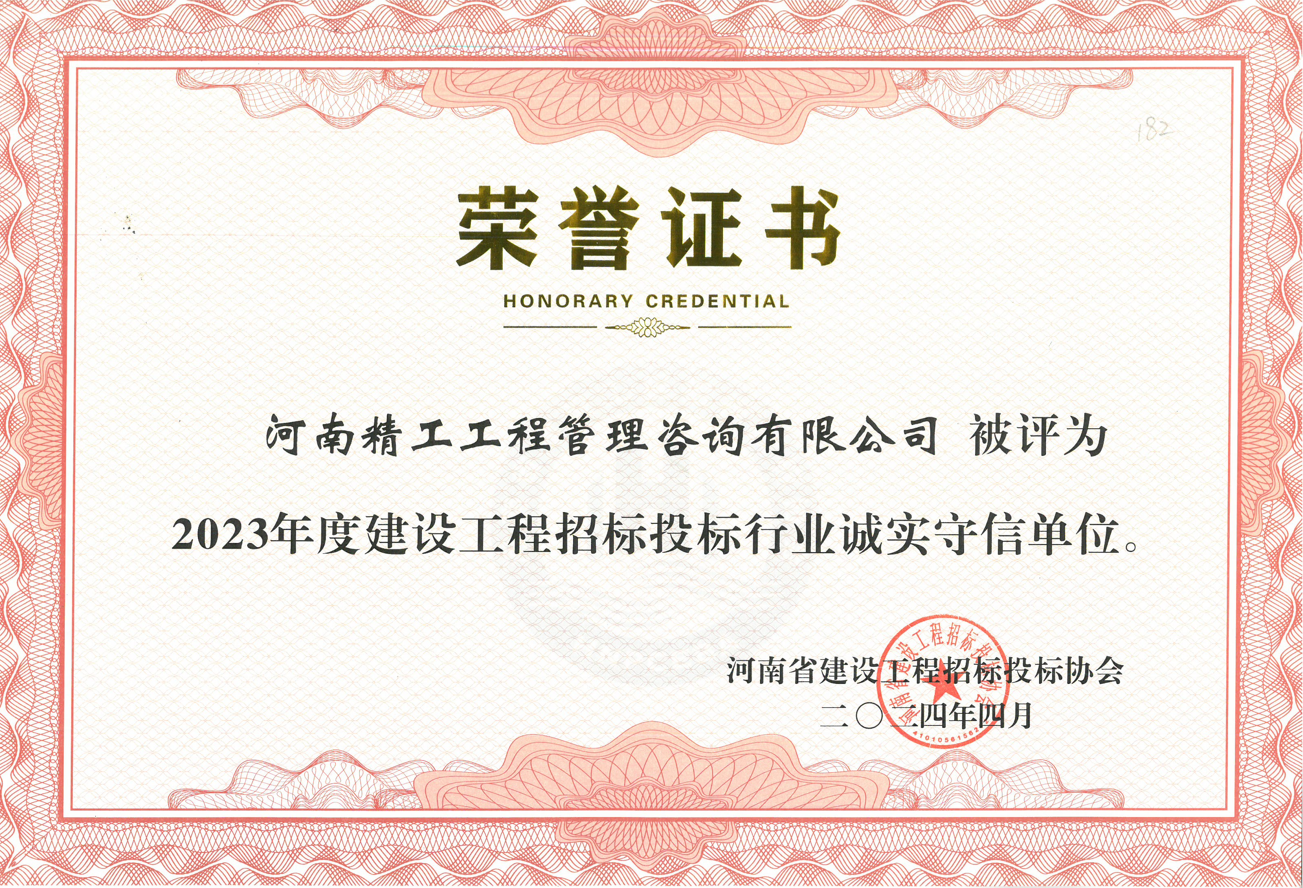 近日,河南省建設工程招標投標協會發布了關于公布2023年度建設工程招標投標行業誠實守信單位的通知(【豫建招協字〔2024〕11號】),河南精工工程管理咨詢有限公司榮獲“2023年度建設工程招標投標行業誠實守信單位”榮譽稱號。